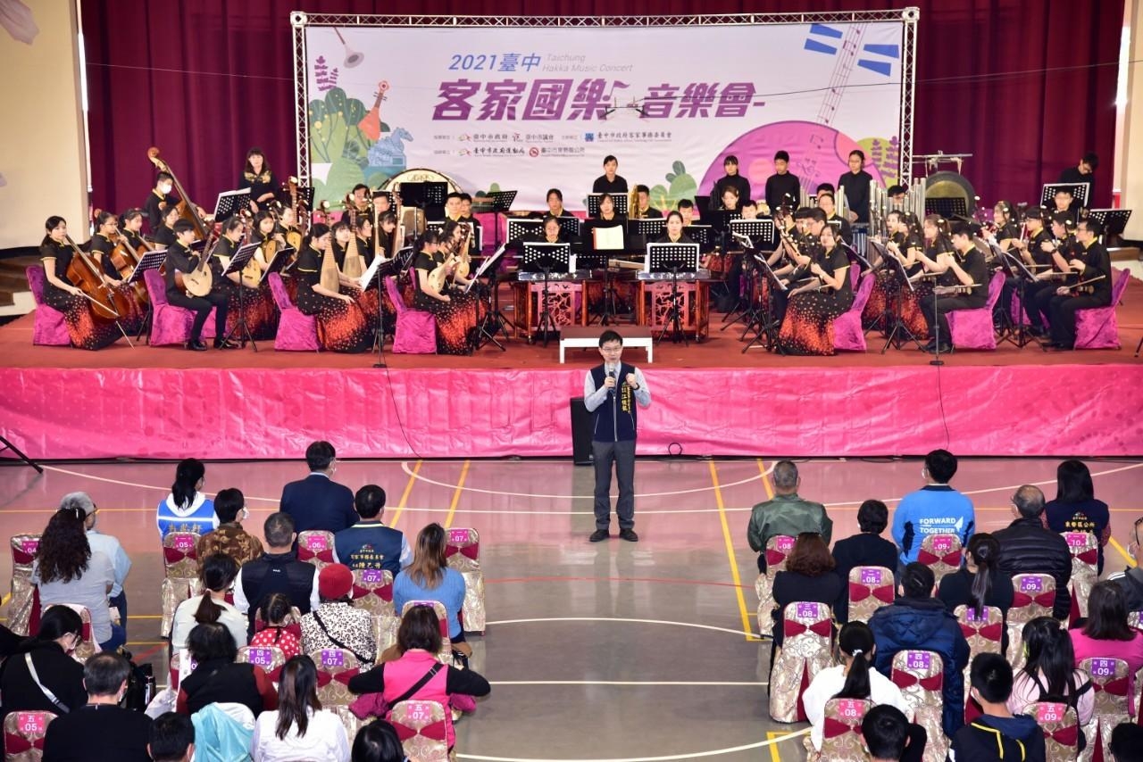 2021臺中客家國樂音樂會於12月5日在臺中樂活園區-樂活運動館辦理,活動現場貴賓雲集,市府客家事務委員會主委江俊龍、市議員冉齡軒、市府參議孫鍾興、市政顧問張愛新、吳國基、客家委員會客發中心組長馬紀政、市府客委會委員陳乙升、劉志宗、劉明和、吳維章、林國清、林若蓁、台中市民防大隊長吳尚鷹、東勢區長翁培真等人均出席,立委江啟臣也派代表共襄盛舉。