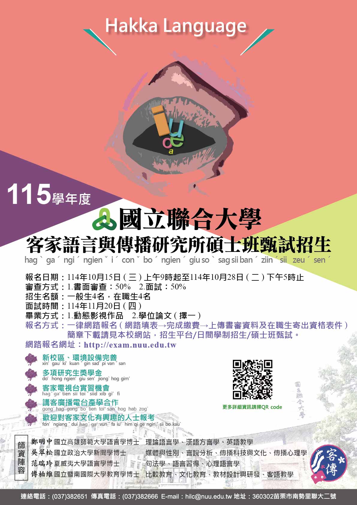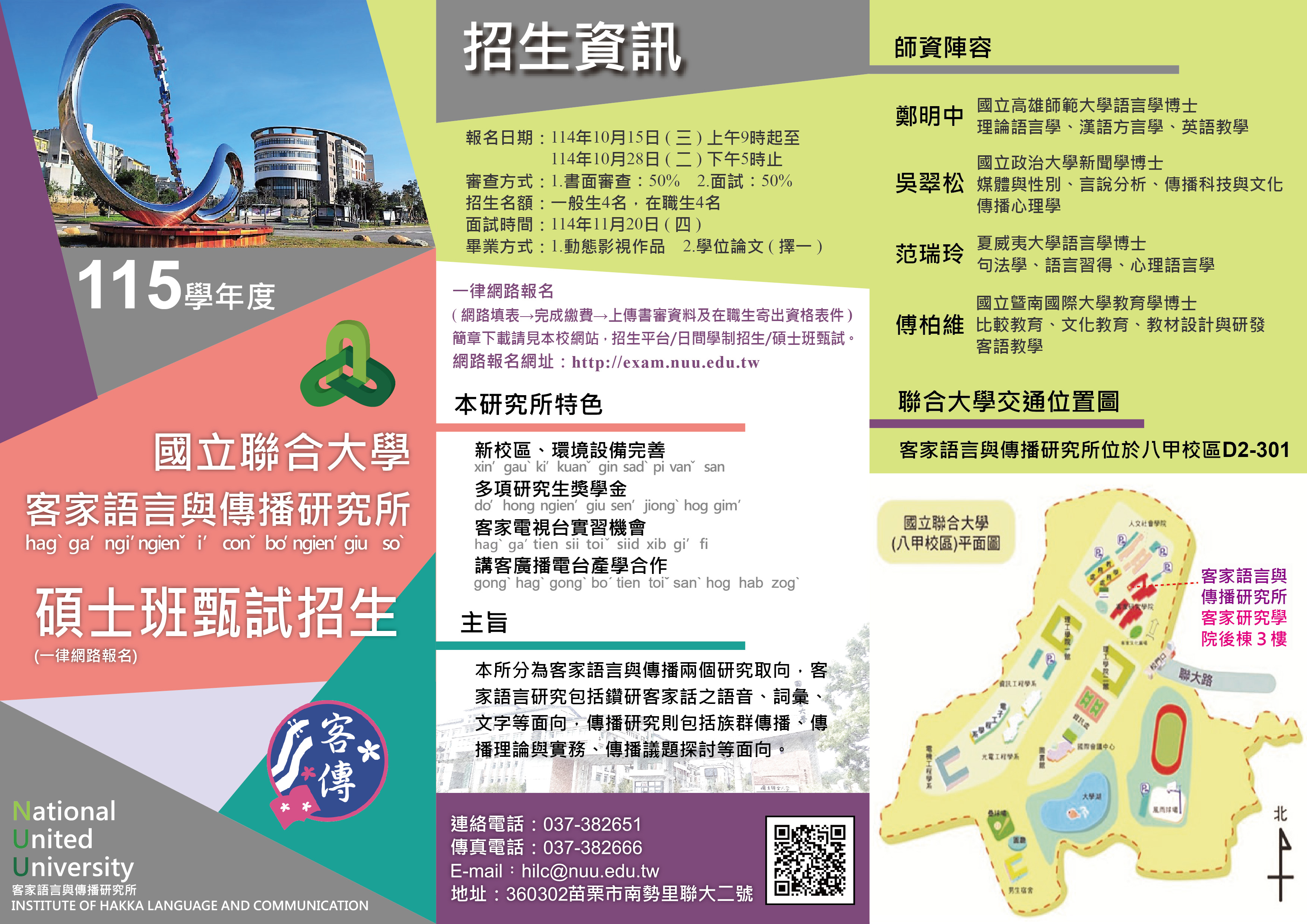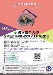 (一)客家語言與傳播研究所115學年度碩士班甄試招生,報名日期自114年10月15日(三)上午9時起至114年10月28日(二)下午5時止。 (二)報名方式:一律網路報名,上傳書審資料,請上國立聯合大學首頁〔招生平台〕參閱。報名網址:http://exam.nuu.edu.tw