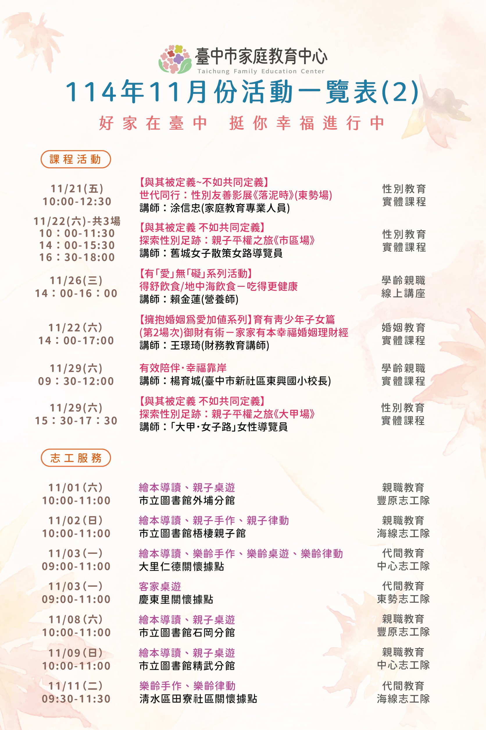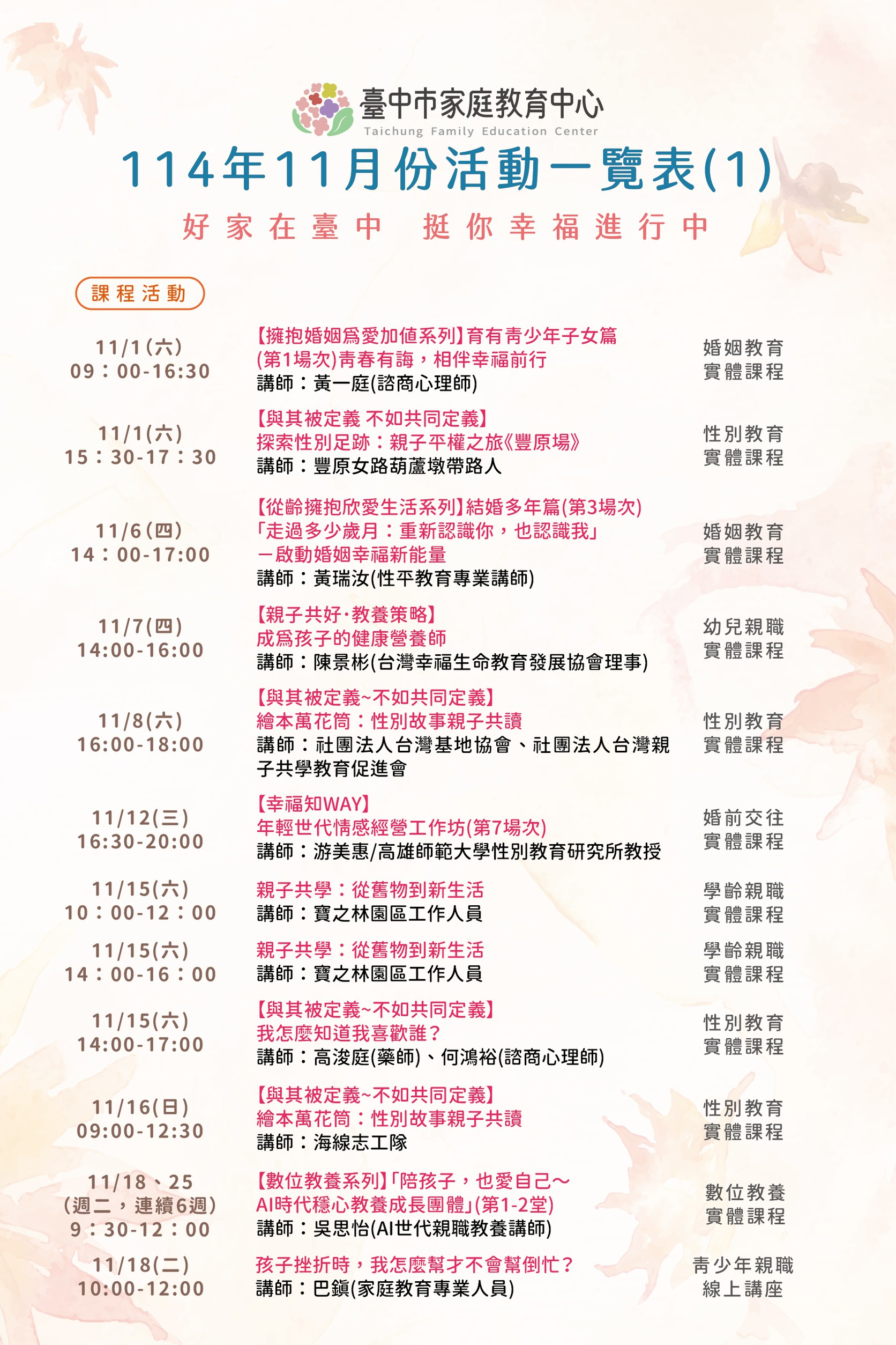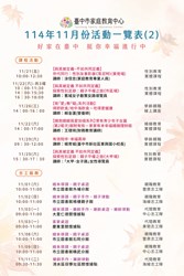 【轉知】臺中市家庭教育中心114年11月份活動一覽表